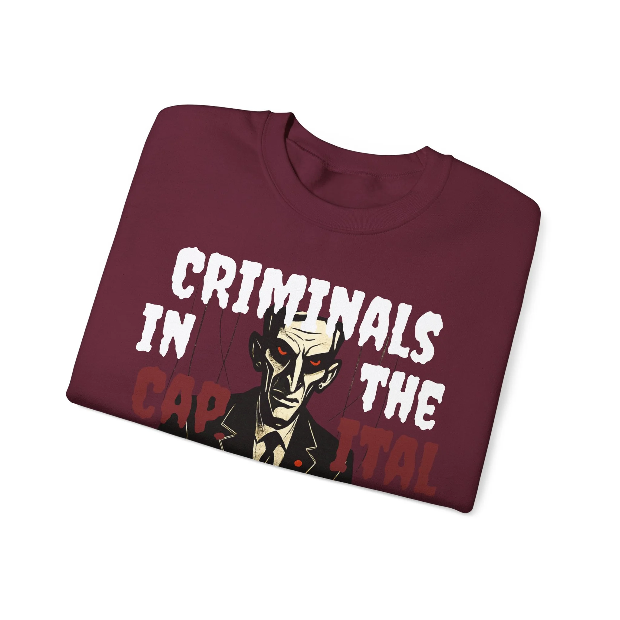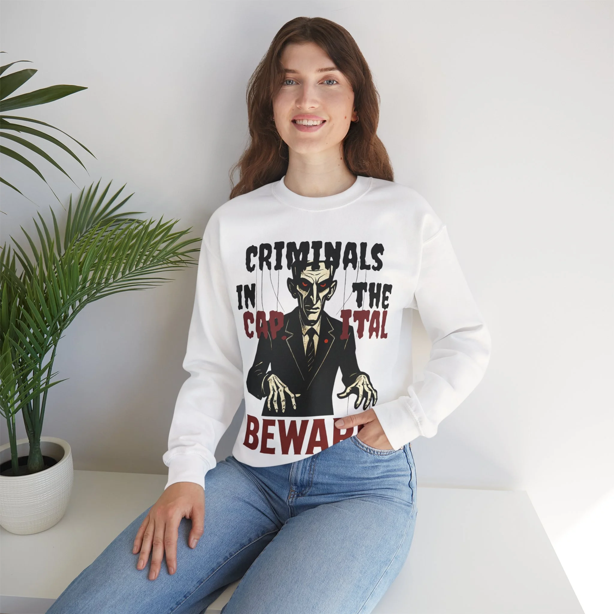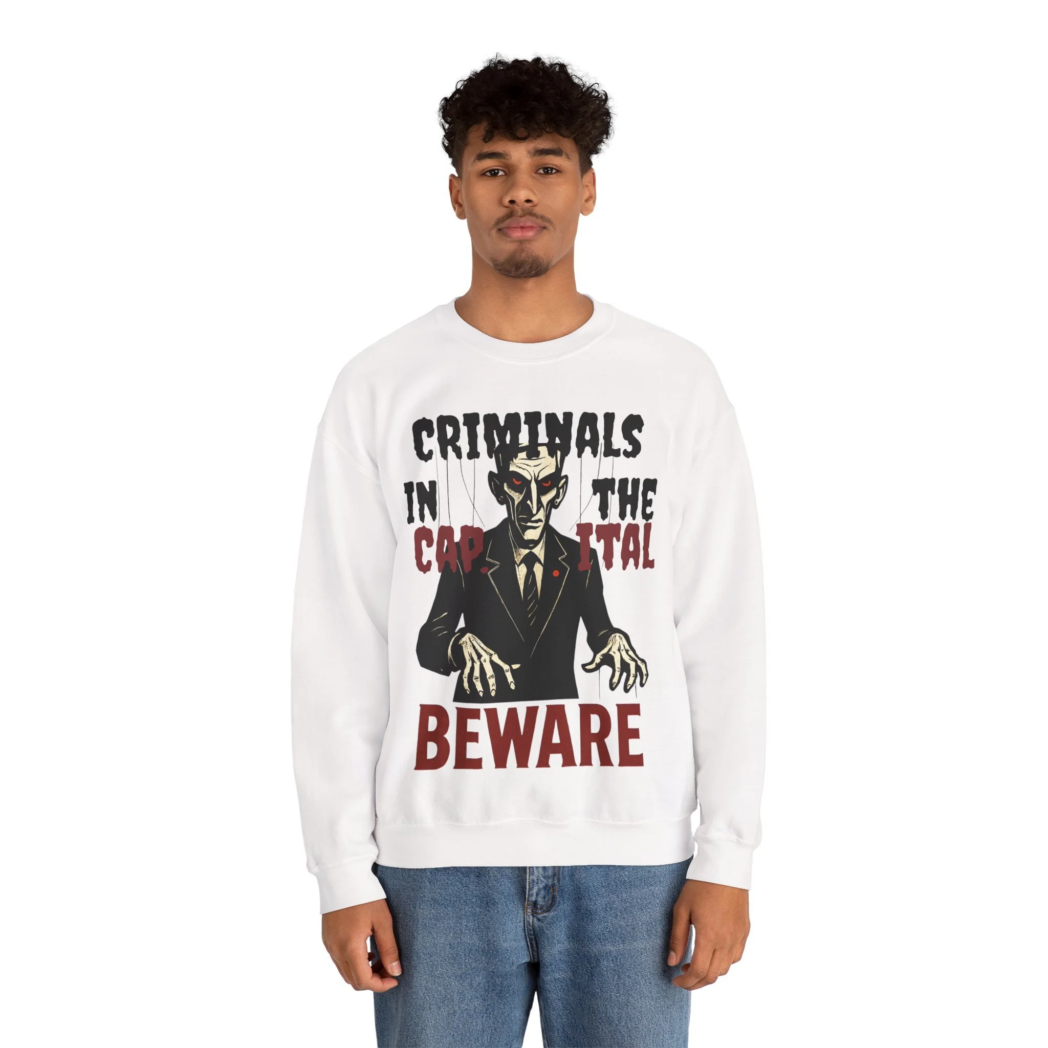 This criminals in the capital sweatshirt exudes a cool and edgy vibe, perfect for those who appreciate unique and statement pieces in their wardrobe. It is ideal for individuals who enjoy expressing themselves through fashion and standing out from the crowd. This sweatshirt is relevant for casual wear, street style, and urban fashion enthusiasts, and can be worn during music festivals, art events, and social gatherings.